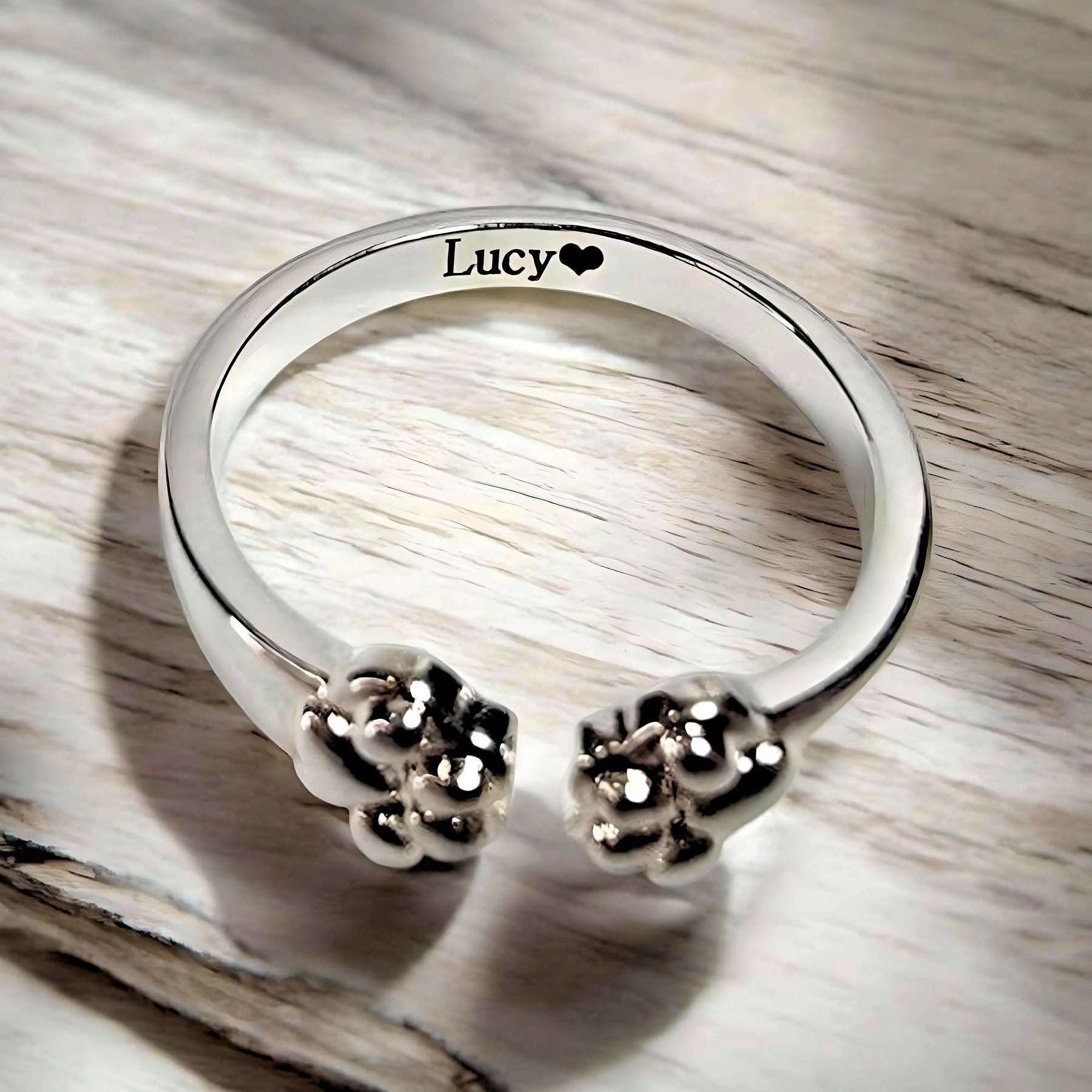 With its adjustable band shaped like two paws gently embracing your finger, it’s delicately engraved with your pet’s name inside—transforming a charming accessory into a treasured keepsake you'll hold dear forever.
